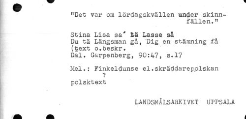 //// "Det var om lördagskvällen under skinn- //// fällen." //// — - //// Stina Lisa sa^ tä Lasse så //// Du tä Längsman gå, Dig en stämning få //// (text o.beskr. //// Dal. Garpenberg, 90:47, s.17 //// Mel.: Finkeldunse el.skräddarepplskan //// + //// polsktext //// LANDSMALSARKIVET UPPSALA ////