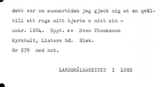 //// dett var om sommartiden jag gjeck mig ut en qväl- //// till att roga mitt hjerta o mitt sin - //// omkr. 16^4* Uppt. av Sven Thomasson //// Kyrkhult, Listers hd. Blek. //// Nr 579 med not. //// 4 //// LANDSMÅLSARKIVET I LUND ////