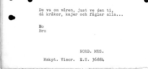 //// De va om våren, just ve den ti, //// ^^ då kråkor, kajer och fåglar alla... //// Bo //// Bro //// - //// NORD. MUS. //// Mskpt. Visor. E.U. 36884 ////