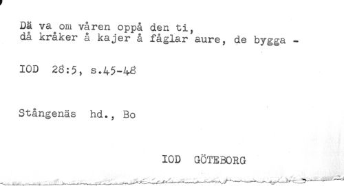 //// Dä va om våren oppå den ti, //// då kråker å kajer å fåglar aure, de bygga - //// IOD 28:5, s.45-48 //// Stångenäs hd., Bo //// IOD GÖTEBORG ////