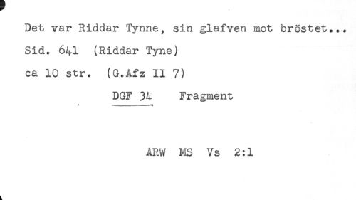 //// Det var Riddar Tynne, sin glafven mot bröstet... //// Sid. 641 (Riddar Tyne) //// ca 10 str. (G.Afz II 7) //// DGF 34 Fragment //// ARW MS Vs 2:1 //// k ////