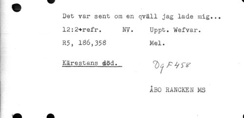 //// Det var sent om en qväll jag lade mig... //// 12:2+refr. NV. Uppt. Wefvar. //// R5, 136,353 Mel. //// Kärestans död. ^^/^f^ //// //// /ÅBO RANCKEN MS ////