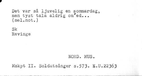 //// Det var så ljuvelig en sommardag, //// men tyst tala aldrig om*ed... //// (mel.not.) //// Sk //// Revinge //// NORD. MUS. //// Mskpt II. Soldatsånger s.573* E.U.22363 ////