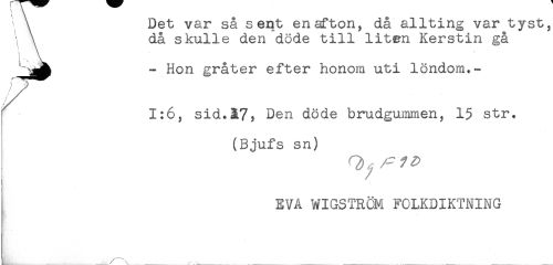 //// \ Det var så sent en afton, då allting var tyst, //// ' \ då skulle den döde till liten Kerstin gå //// * \ //// - Hon gråter efter honom uti löndom.- //// //// /r 1:6, sid.A7, Den döde brudgummen, 15 str. //// (Bjufs sn) //// EVA WIGSTRÖM FOLKDIKTNING //// L,.,...—....1.',.^..... ////