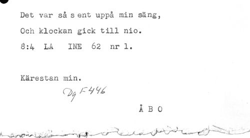 //// Det var så s ent uppå min säng, //// Och klockan gick till nio. //// 8:4 LA INE 62 nr 1. //// Kärestan min. ////
