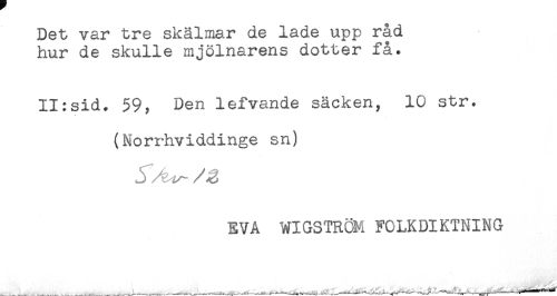 //// Det var tre skälmar de lade upp råd //// hur de skulle mjOlnarens dotter få. //// II:sid. 59, Den 1efvande säcken, 10 str. //// (Norrhviddinge sn) //// EVA WIGSTRÖM FOLKDIKTNING //// ____ J , _____^.LL-.,,^ 'J< ' ' ////