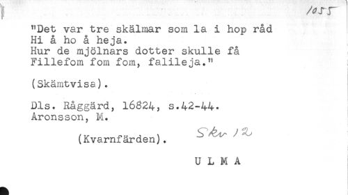 //// j, /yj j //// ^Det var tre skälmar som la i hop råd //// Hi å ho å heja. //// Hur de mjölnars dotter skulle få //// Fillefom fom fom, falileja." //// i //// (Skämtvisa). //// Dis. Råggärd, 16324, s.42-44- //// Aronsson, M. //// (Kvarnfärden). ^^^ //// U L M A ////