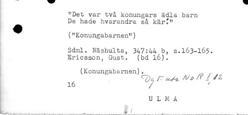 //// ^'Det var två konungars ädla barn //// De hade hvarandra så kär^" //// ("Konungabarnen") //// Sdml. Näshulta, 347:44 b, s.163-16$. //// Ericsson, Gust. (bd 16). //// (Konungabarnen) . //// /r ^ /t/^ # //// /16 //// U L M A //// L____.___i'___ ////