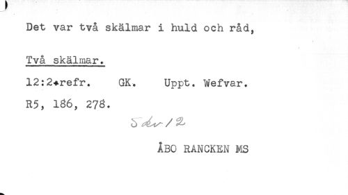 //// Det var två skälmar i huld och råd, //// * //// //// /Två skälmar. //// 12:2.refr. GK. Uppt. Wefvar. //// R5, 166, 276. //// / ^ //// ÅBO RANCKEN NiS ////