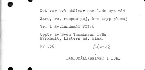 //// Det var två skälmar som lade upp råd //// K Skro, ro, rompom pej, kom kryp på mej //// Tr. i Sv.Landsmål VII:6 //// Upptv av Sven Thomasson 1364 //// Kyrkhult, Listers hd. Blek. //// Nr 556 //// LANDSMÅLSARKIVET I LUND ////
