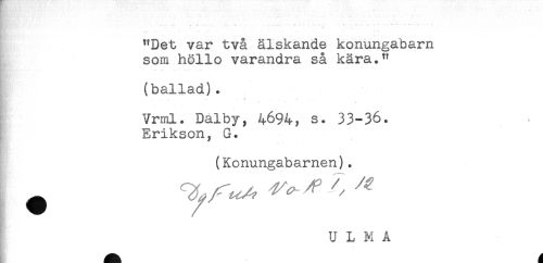 //// '"'--t-. //// /' //// "Det var två älskande konungabarn //// som höllo varandra så kära." //// (ballad)* //// Vrrnl. Dalby, 4694? s. 33-36* //// Erikson, G. //// (Konungabarnen). //// U L M A ////