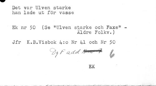 //// Det var Ulven starke //// han lade ut för vasse //// Ek nr 50 (Se "Ulven starke och Faxe" - //// Äldre Folkv.) //// Jfr K.B.Visbok 4:o Nr 41 och Nr 50 //// EK ////
