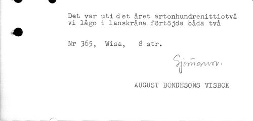 //// Det var uti det året artonhundrenittiotvå //// vi lågo i lanskråna förtöjda båda två //// Nr 365, Wisa, 3 str. //// ^ vri/ * //// AUGUST BONDESONS VISBOK //// r //// :......—..... .... .... ////