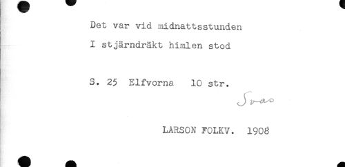 //// Det var vid midnattsstunden //// I stjärndräkt himlen stod //// S. 25 Elfvorna 10 str. //// LARSON FOLKV. 1908 ////