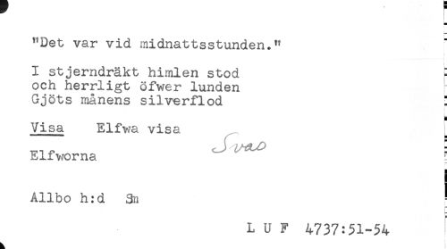 //// { //// t //// "Det var vid midnattsstunden." //// I stjerndräkt himlen stod ^ //// och herrligt öfwer lunden r //// Gjöts månens silverflod ' //// Visa Elfwa visa //// Elfworna - ^ //// Allbo h:d 3n ! //// L U F 4737:51-54 //// r //// ä. ////