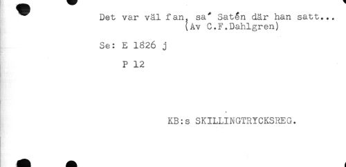 //// Det var väl fan, sa" Saten där han satt... //// (Av C.F.Dahlgren) //// Se: E 1826 j //// P 12 //// * //// KB:s SKILLINGTRYCKSREG. ////