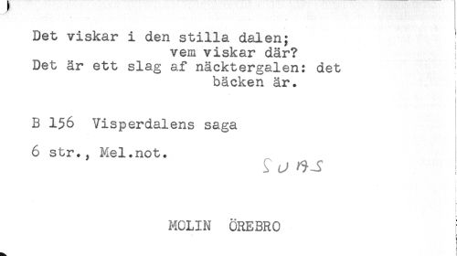 //// Det viskar i den stilla dalen; //// vem viskar där? //// Det är ett slag af näcktergalen: det //// bäcken är. i //// < //// B 156 Visperdalens saga //// 6 str., Mel.not. //// t //// t //// i //// t //// MOLIN ÖREBRO ////