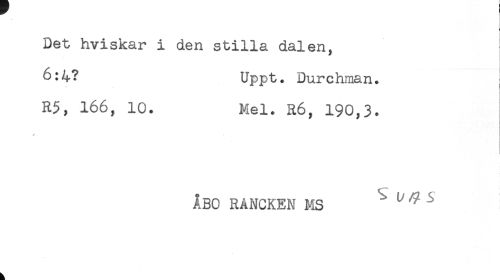 //// - //// Det hviskar i den stilla dalen, //// * //// 6:4? Uppt. Durchman. //// R5, 166, 10. Mel. R6, 190,3. //// ÅBO RANCKEN MS " ^ ////
