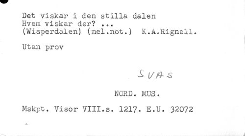 //// Det viskar i den stilla dalen //// Hvem viskar der? ... //// (Wisperdalen) (mel.not.) K.A.Rignell. //// Utan prov //// i //// NORD. MUS. //// Mskpt. Visor VIII.s. 1217* E.U. 32072 //// -....... ... j ////