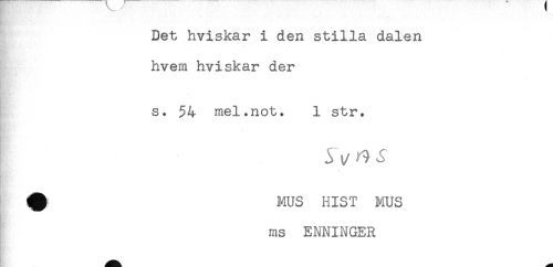 //// Det hviskar i den stilla dalen //// hvem hviskar der //// s. $4 mel.not. 1 str. //// t //// ^ MUS HIST MUS //// ms ENNINGER //// - //// — ////