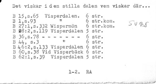 //// Det viskar iden stilla dalen vem viskar dar... //// B 15,s.65 Visperdalen. 6 str. //// B l,s.93 " 6 str.kom. //// B 27:1,s.332 Wispermön 6 str.kom. -> //// B &3:2,s.ll9 Visperdalen $ str. //// B 36,s.73----6 str. //// B 44, s.3 " 6 str. //// B 46:2,s.133 Visperdalen 6 str. //// B 60,s.33 Vid Visperbäck 6 str. //// B 62:1,s.39 Visperdalen 5 str. //// * //// 1-2. RÅ ////