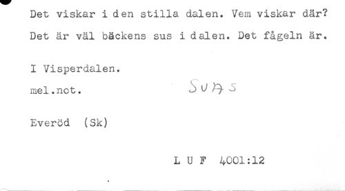 //// Det viskar i den stilla dalen. Vem viskar darr //// Det är väl bäckens sus i dalen. Det fågeln är. //// I Visperdalen. //// mel. not. jU^-J //// Everöd (Sk) //// L U F 4001:12 ////