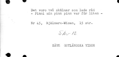 //// Det voro två skälmar som lade råd //// - Pinni min pinn pinn var för liten - //// Nr 45, Mjölnare-Wisan, 15 str. //// - //// SÄVE GOTLÄNDSKA VISOR //// ! _ ////