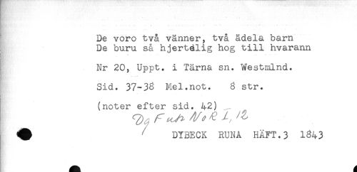 //// I De voro två vänner, två ädela barn //// t De buru så hjertélig hog till hvarann //// I Nr 20, Uppt. i Tärna sn. Westmlnd. //// Sid. 37-38 Mel.not. 8 str. //// (noter efter sid. 42) ^ //// DYBECK RUNA HAFT. 3 1^43 ////