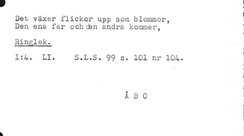 //// [ //// Det växer flickar upp som blommor, ' //// Den ena far och<^n andra kommer, ' //// i //// Ringlek. ' //// . //// 1:4. LI. S.L.S. 99 s. 101 nr 104. ' //// i //// t //// t //// i //// < //// ÅBO i //// ^ ! ////