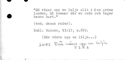 //// "Dä växer opp en lelja allt i den gröna //// ^ lunden, Så kommer där en ovän och tager //// ^ henne bort." //// (end. dessa rader). //// i' //// Smål. Hossmo, 93:17, s.859. //// (Där växte upp en lilja...) //// j U L M Å //// r....._____...... ////