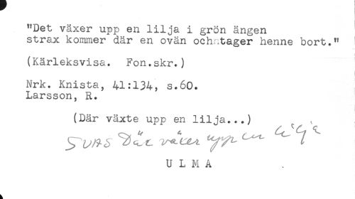 //// "Det växer upp en lilja i grön ängen //// strax kommer där en ovän ochntager henne bort." ! //// (Kärleksvisa. Fon.skr.) //// t //// ! //// Nrk. Knista, 41:134, s.60. //// Larsson, R. //// (Där växte upp en lilja...) //// U L M A ////