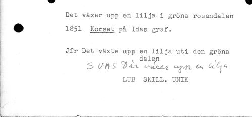 //// Det växer upp en lilja i gröna rosendalen //// V 1851 Korset på Idas graf. //// i ' //// Jfr Det växte upp en lilja uti den gröna //// , dalen //// LUB SKILL. UNIK ////