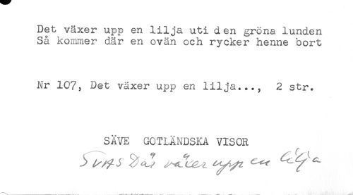 //// Det växer upp en lilja uti den gröna lunden //// Så kommer där en ovän och rycker henne bort //// Nr 107, Det växer upp en lilja..., 2 str. //// SAVE GOTLÄNDSKA VISOR ////