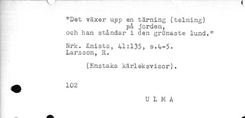 //// "Det växer upp en tärning (telning) //// på jorden, //// och han ståndar i den grönaste lund." //// Nrk. Knista, 41:135, s.4-5. //// Larsson, R. //// - //// g' ) //// (Enstaka kärleksvisor). //// U L M A ////