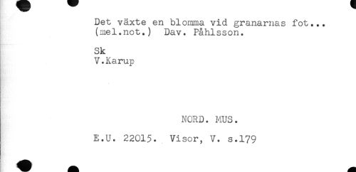 //// Det växte en blomma vid granarnas fot... //// (mel.not.) Dav. Påhlsson. //// Sk //// V.Karup //// NORD. MUS. //// E.U. 22015. Visor, V. s.179 ////