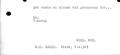 //// i Det växte en blomma vid granarnas fot... //// ^ Sk. //// ! //// V. Karup //// i //// NORD. MUS. //// ! //// E.U. 22015. Visor, V.s.323 ////