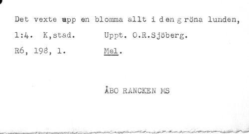 //// Det vexte app en blomma allt i den g röna lunden, //// 1:4. K,stad. Uppt. O.R.Sjöberg. //// R6, 198, 1. Mel. //// ÅBO RÄNCKEN MS ////