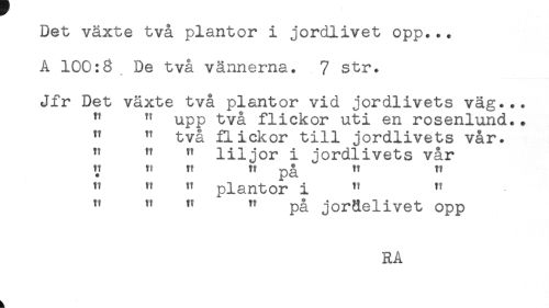 //// Det växte två plantor i jordlivet opp... //// A 100:3 De två vännerna. 7 str. //// Jfr Det växte två plantor vid jordlivets väg... //// " " upp två flickor uti en rosenlund.. //// " " tvä flickor till jordlivets vår. //// " " " liljor i jordlivets vår //// 1.1 tt t! tt p^ " t? //// " " " plantor i " " //// " " " " på joräelivet opp ////