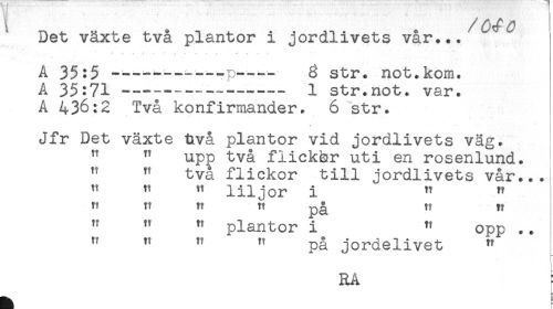 //// Det växte två plantor i jordlivets vår...^^ //// * f - ! * * t - .* t < t //// A 35:$ ——---——— g str. not.kom. //// A 35:71---— — - 1 str.not. var. //// A 436:2 Två konfirmander. 6 str. //// * //// Jfr Det växte två plantor vid jordlivets väg. //// " " upp två flickar uti en rosenlund. //// " " två flickor till jordlivets vår... //// " " " liljor i " " //// " t! tt tt P^ n !t //// " " " plantor i " opp .. //// " " " " på jordelivet " ////