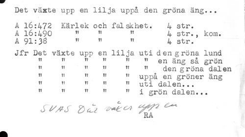 //// Det växte upp en lilja uppa den gröna äng... ; //// A 16:472 Kärlek och falskhet. 4 str. //// A 16:490 " " " 4 str., kom. //// A 91:38 " ^ " 4 str. i //// Jfr Det växte upp en lilja uti den g röna lund //// " n tT tt tt M ^^ ^^g g^ grön //// ^ ^ ^ " ^ ^ den gröna dalen //// " ^ ^ ^ " uppå en gröner äng //// " ^ ^ ^ ^ uti dalen... //// " ^ ^ n ^ i grön dalen... ////