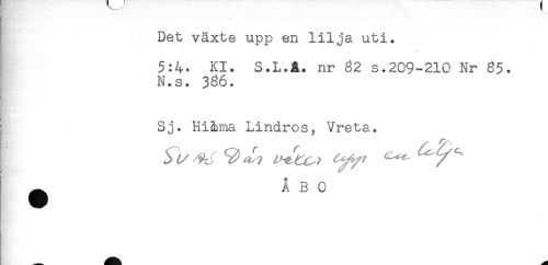 //// Det växte upp en lilja uti. //// I 5:4. Kl. S.L.A. nr 62 s.209-210 Nr 65. //// i N.s. 366. //// , //// Sj. HiMia Lindros, Vreta. //// # ÅBO ////