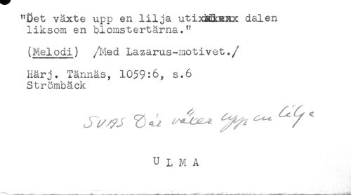 //// "Det växte upp en lilja utixRBoanx dalen //// liksom en blomstertärna." //// (Melodi) /Med Lazarus-motivet. //// /Härj* Tärmäs, 1059:6, s.6 //// Strombäck //// ^ ////