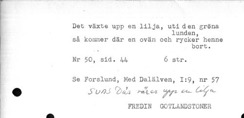//// K.' //// Det växte upp en lilja, uti den gröna //// lunden, //// så kommer där en ovän och rycker henne //// bort. //// t //// Nr 50, sid. 44 6 str. //// Se Forslund, Med Dalälven, 1:9, nr 57 //// FREDIN GOTLANDSTONER ////