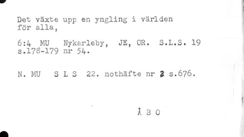 //// Det växte upp en yngling i världen //// för alla, //// 6:4 MU Nykarleby, JE, OR. S.L.S. 19 //// s.176-179 nr 54. //// N. MU SLS 22. nothäfte nr 3 s.676. //// ( //// ] ä ////