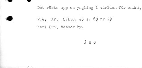 //// Det växte upp en yngling i världen för andra, //// 2:4, KV. S.L.S. 45 s. 63 nr 29 //// * //// Karl Cm, Vassor by. //// ÅBO //// L...... ////