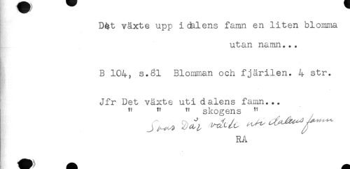 //// D4t växte upp i Gälens famn en liten blomma //// utan namn... //// B 104, s.3l Blomman och fjärilen. 4 str. //// Jfr Det växte uti dalens famn... //// " " " skogens " //// RÅ ////