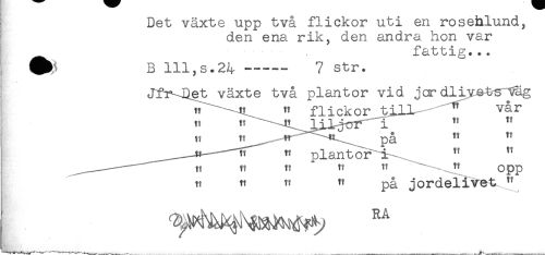 //// Det växte upp två flickor uti en rosenlund, //// den ena rik, den andra hon var //// fattig..< //// W B Ul,s.24----- 7 str. //// Jlr^et växte två plantor vid jordliyets"^äg //// " flickor till- " var //// t! t? ^ på ^ " //// —^ t! plantor....i " ^ //// ....-—— " tt tt tt ^ tt ti t! Opp //// n tt tt tt p^ jordelivet " ////