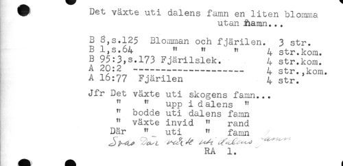 //// W' Det växte uti dalens famn en liten biorama //// utan Aamn... //// B S,s.l25 Blomman och fjärilen. 3 str. //// B l,s.64 " " " 4 str.kom. //// B 95:3,S.173 Fjärilslek. 4 str.kom. //// A 20:2 ----str. ,kom. //// A 16:77 Fjärilen 4 str. //// Jfr Det växte uti skogens famn... //// " " upp i dalens " //// " bodde uti dalens famn //// " växte invid " rand //// Där " _ uti " famn //// RA 1. ////