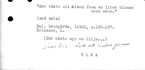 //// "Det växte uti(ålens farm en liten blomma //// utan namn." //// ^ (med mel$) //// Dal. Grangärde, 14900, s.136-187* //// Eriksson, L. //// (Där växte upp en lilja...) //// ^ z : , yr , , ^ — //// U L M A ////