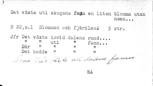 //// Det växte uti skogens fagn en liten blomma utan //// namn... //// B 22,s.l Blomman och fjärilenö 5 str. //// ! //// Jfr Det växte invid dalens rand.... //// " " uti " famn... //// Där " " " tt //// Det bodde " " " //// RA //// t ////